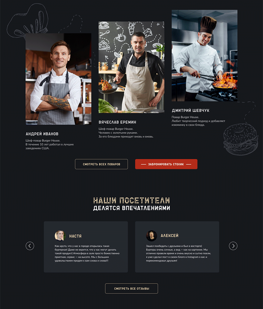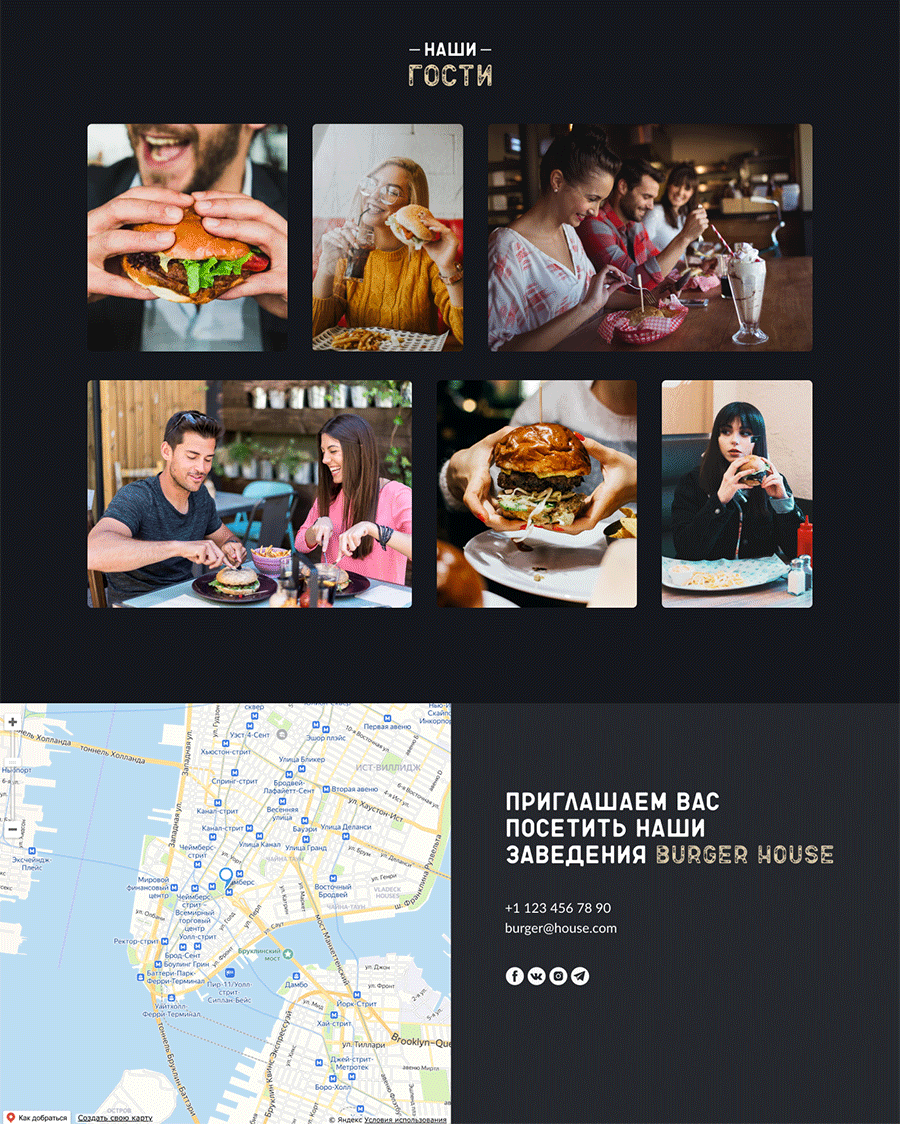 Burger House — сеть бургерных заведений по всей России с эксклюзивными авторскими рецептами приготовления бургеров с возможностью быстрой доставки на дом или в офис, или самовывозом из ресторана. Идея и название Burger House является концептом, для которого был создан сайт и сверстан на Tilda.