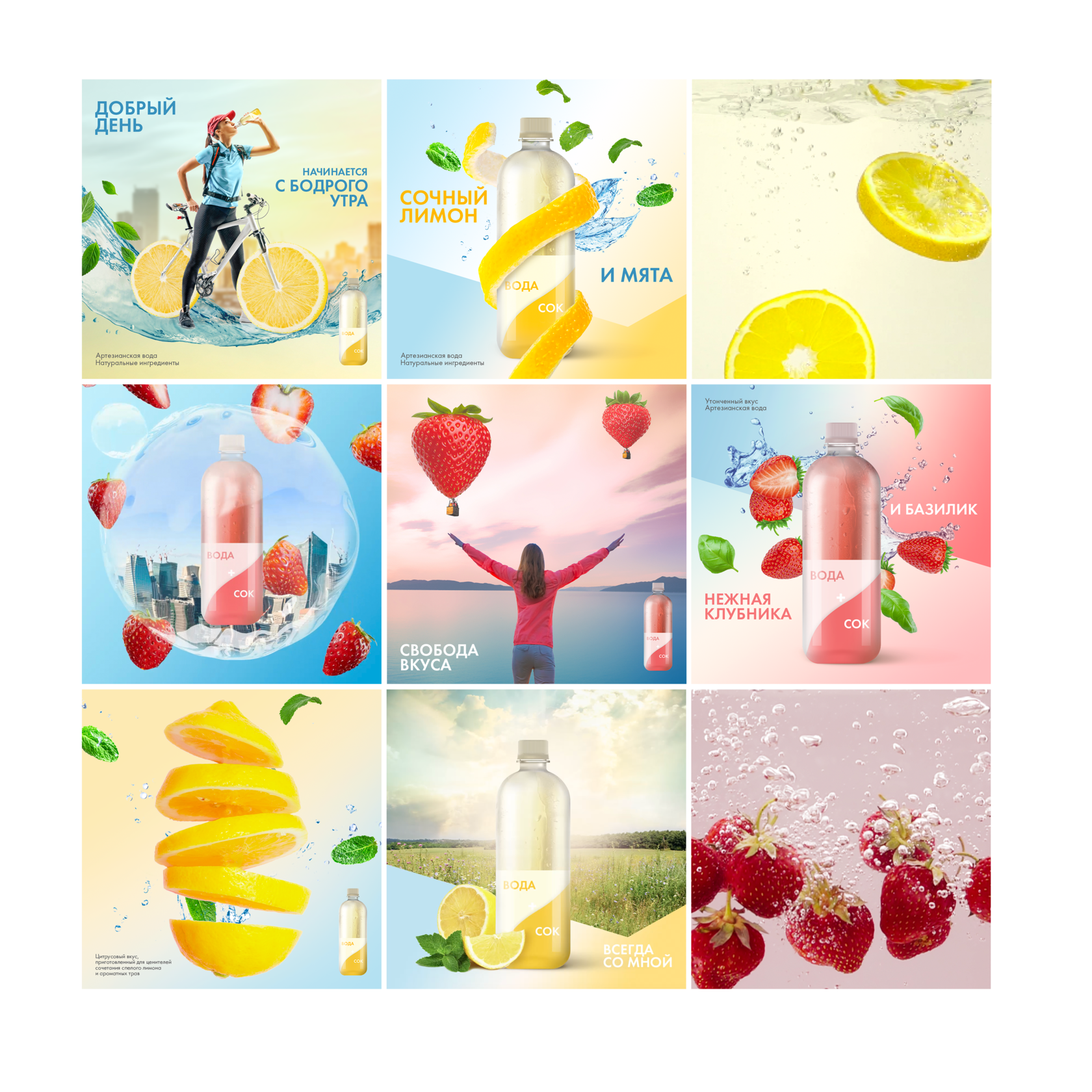 В основе были использованы чистые светлые и лаконичные цвета бренда + подобрана дополнительная цветовая гамма, изображения спелых фруктов и ягод в сочетании со всплесками воды. Разработаны креативные коллажи с использованием фруктов и ягод, которые внедряются в жизнь героев. В анимациях использованы реалистичные видео с водой, ягодами, фруктами, 3d элементы, стоп-моушен.