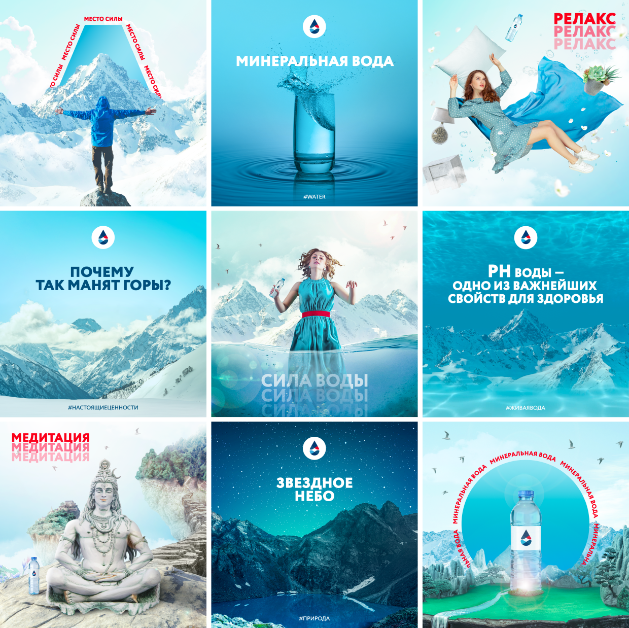 Разработка концепта дизайна для социальных сетей для бренда воды. Дизайн создан на примере ленты Instagram из 9 постов.